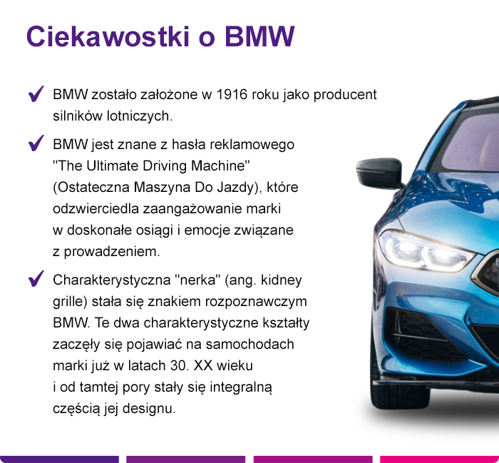 Mało kto nie zna marki BMW. Czy wiesz, że ten brand pierwotnie produkował silniki lotnicze, a dopiero później rozszerzył swoją działalność na konstruowanie samochodów i motocykli? Historia marki BMW liczy ponad 100 lat. Przez ten czas firma wyprodukowała wiele znanych i cenionych modeli dla segmentu A, B, C oraz D. Począwszy od miejskich aut, skończywszy na pojazdach rodzinnych z nadwoziem kombi oraz sedan.