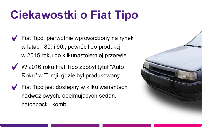 Czy wiesz, że Fiat Tipo został zaprojektowany z myślą o funkcjonalności i praktyczności, a po wprowadzeniu na rynek zdobył wiele nagród, w tym tytuł Samochód Roku 1989 w Europie? Model jest również doceniany przez polskich kierowców i od swojego debiutu w latach 80. jest uważany za pojazd nowoczesny i wyjątkowo przestronny w swojej klasie.
