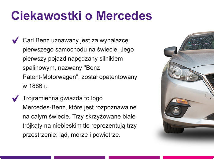 Mercedes-Benz to marka premium samochodów osobowych, która w swoje ofercie ma również ciężarówki i autobusy. Czy wiesz, Mercedes-Benz był pionierem wielu innowacji technologicznych w przemyśle motoryzacyjnym, takich jak system ABS, system ESP? To właśnie sprawia, że produkowane przez Mercedes Benz pojazdy słyną z niezawodności, imponujących osiągów i nowoczesnych technologicznych rozwiązań. Trwa już to od 1883 roku.