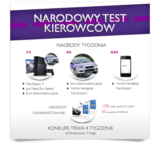 Ruszył Narodowy Test Kierowców – konkurs na Facebook’u zorganizowany przez LINK4 wspólnie z programem PAYBACK. Za pomocą specjalnej aplikacji po odpowiedzi na kilka pytań każdy biorący udział w konkursie otrzyma zwrotną informację, jakim jest typem kierowcy oraz nagrodę gwarantowaną – 15% zniżki na ubezpieczenie komunikacyjne i 50 punktów, jeśli jest posiadaczem karty PAYBACK.