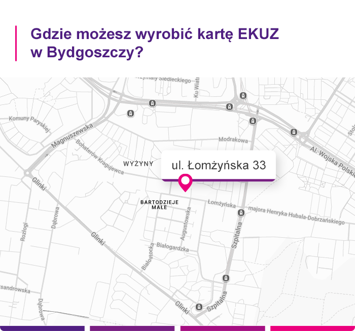 Europejską Kartę Ubezpieczenia Zdrowotnego (EKUZ) w Bydgoszczy możesz wyrobić w lokalnym oddziale NFZ, który znajduje się pod adresem: ul. Łomżyńska 33, 85-863 Bydgoszcz. W razie pytań możesz zadzwonić do NFZ w Bydgoszczy pod numer 800-190-590 lub wysłać e-mail na adres: oddzial.bydgoszcz@nfz-bydgoszcz.pl.