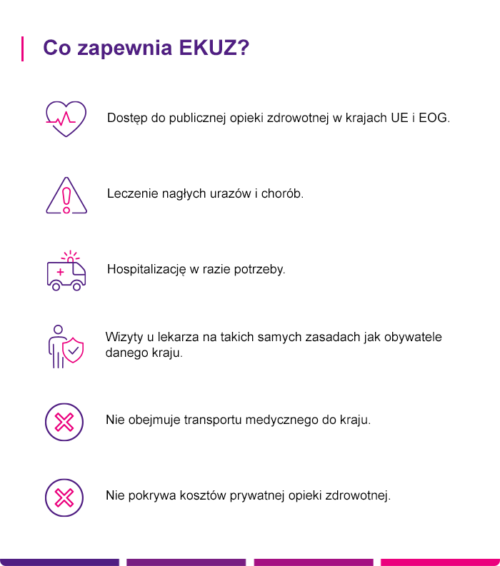 Europejska Karta Ubezpieczenia Zdrowotnego (EKUZ) to dokument uprawniający do korzystania z publicznej opieki zdrowotnej w krajach Unii Europejskiej oraz Europejskiego Obszaru Gospodarczego (Islandia, Liechtenstein, Norwegia, Szwajcaria, Wielka Brytania) na takich samych zasadach jak obywatele tych krajów. Aby móc korzystać z EKUZ, musisz mieć prawo do świadczeń zdrowotnych finansowanych przez polski system publiczny.