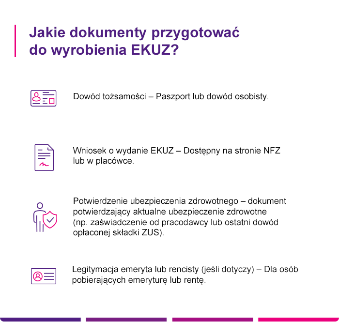 - Wypełniony i podpisany wniosek o wydanie EKUZ – dostępny na stronie NFZ lub bezpośrednio w oddziale.
