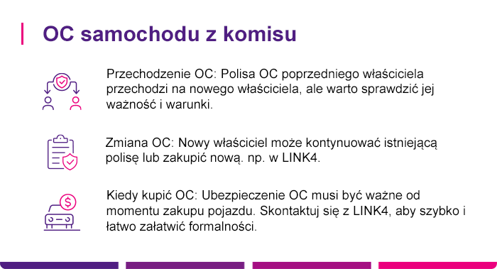 Jeśli kupisz auto z komisu i umowa ubezpieczenia zbywcy przejdzie na Ciebie, możesz z niej korzystać aż do jej dnia zakończenia. Pamiętaj jednak, że ubezpieczenie nie odnawia się automatycznie, dlatego minimum dzień przed jego zakończeniem wykup nowe OC. Dzięki temu zachowasz ciągłość ochrony ubezpieczeniowej.