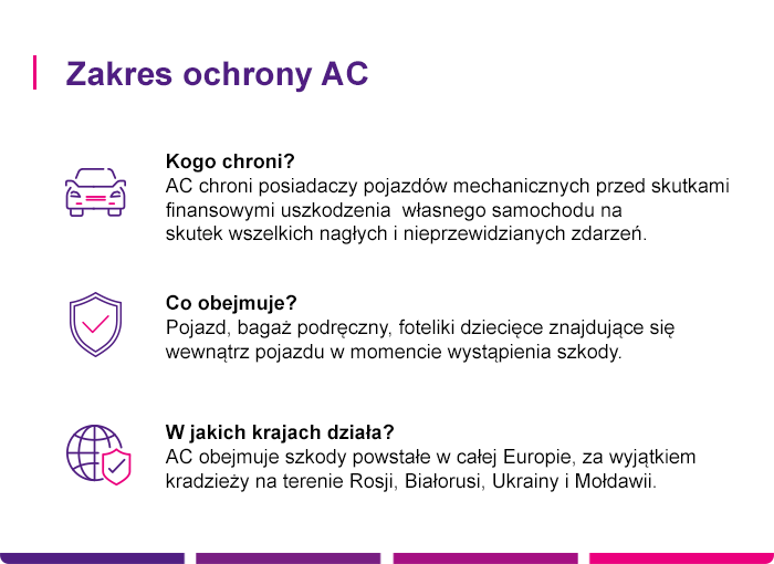 Dowiedz się, dlaczego nasze ubezpieczenie AC jest najlepszym wyborem dla Ciebie i Twojego samochodu. Poznaj jego zakres ochrony oraz warianty likwidacji szkody.