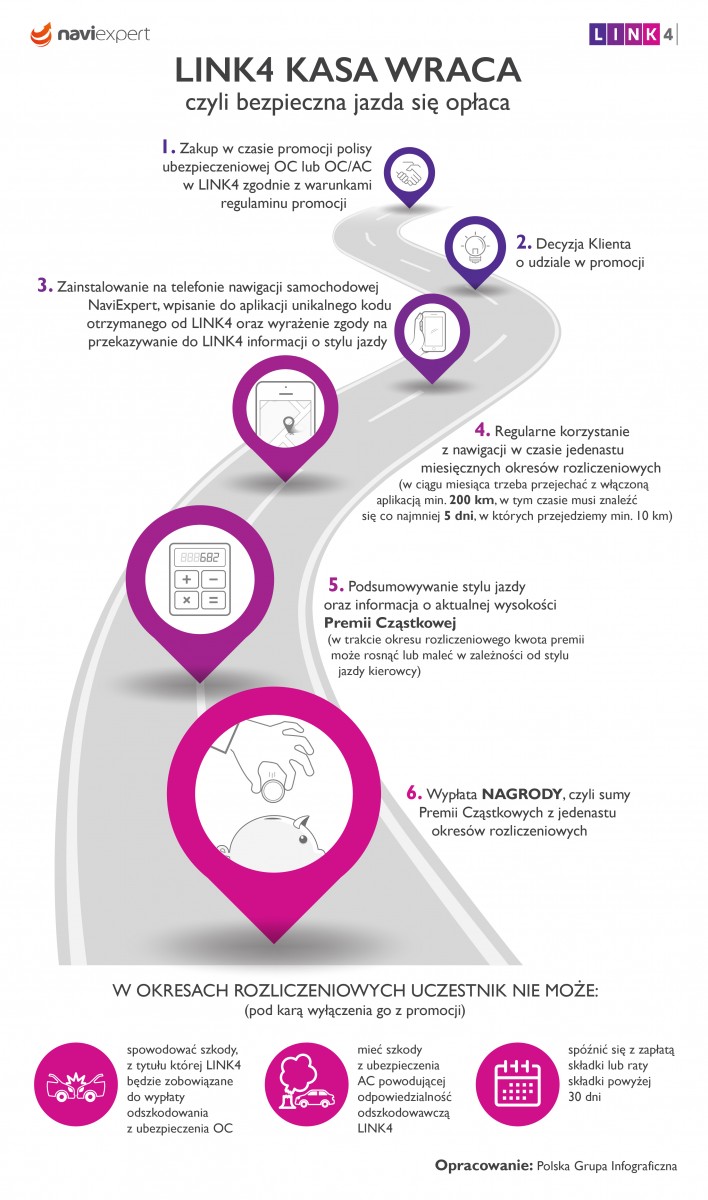 Aby otrzymać nagrodę za bezpieczną jazdę wystarczy, że przejedziesz samochodem z włączoną nawigacją i modułem LINK4 Kasa Wraca minimum 200 km w miesiącu (w tym czasie uruchamiając aplikację w trakcie co najmniej 5 różnych dni i pokonując danego dnia minimum 10 kilometrów). Każdy, spośród 11 miesięcy analizowanych przez ubezpieczyciela w ciągu roku jest rozliczany oddzielnie, a zwrot składki jest sumą miesięcznych premii i zostanie wypłacony po zakończeniu polisy.