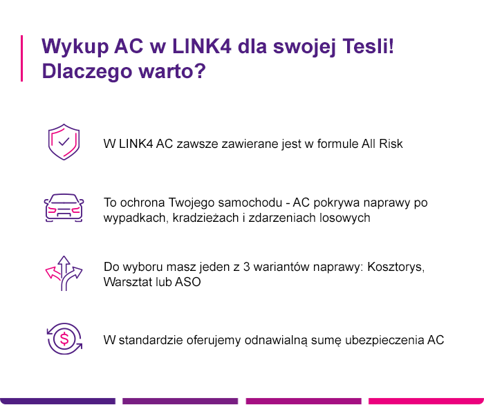 AC to dobrowolne ubezpieczenie Tesli. W LINK4 kupisz go w pakiecie z OC i w formule All Risk. Obejmuje szkody powstałe zarówno w ruchu drogowym, jak i poza nim. Mogą to być uszkodzenia pojazdu spowodowane przez Ciebie, osoby trzecie lub zdarzenia losowe – pożar, gradobicie, stłuczka parkingowa, akt wandalizmu czy kradzież.