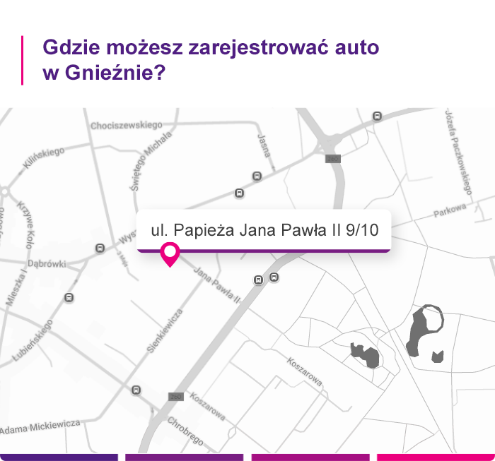 Rejestracja samochodu w Gnieźnie odbywa się w Wydziale Komunikacji i Transportu przy ul. Papieża Jana Pawła II 9/10, 62-200 Gniezno (na parterze)**.