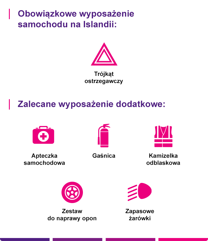 Reszta wyposażenia jest opcjonalna. Ponadto istnieje tu obowiązek posiadania zimowych opon, o ile na drogach zalega śnieg lub lód. Numerem alarmowym jest tu 112. Przed wyjazdem warto kupić ubezpieczenie samochodu na wyjazd do Islandii, gdyż w wielu miejscach jazda tu jest dość trudna. To, jakie ubezpieczenie samochodu na wyjazd do Islandii trzeba kupić, nie jest narzucone z góry, a obowiązkiem jest tylko OC.