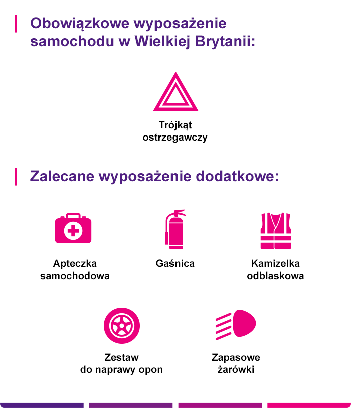 W Wielkiej Brytanii obowiązuje jazda z zapiętymi pasami bezpieczeństwa. Zabronione jest rozmawianie przez telefon podczas jazdy. W Wielkiej Brytanii cena benzyny wynosi około 1,68 funta za litra (stan na 26.01.2023), a litr oleju napędowego kosztuje 1,94 funta (stan na 26.01.2023). Auto musi być wyposażone w trójkąt ostrzegawczy. Posiadanie apteczki, gaśnicy czy też zapasowych żarówek jest zalecane*. Obowiązkowo musisz mieć ubezpieczenie samochodu na wyjazd do Wielkiej Brytanii.
