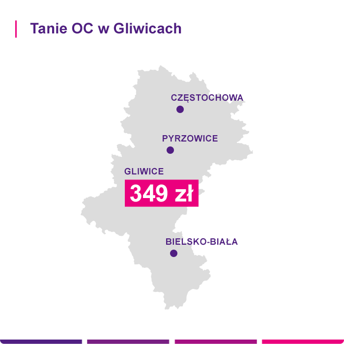Warto też dowiedzieć się, jak na tle innych miast prezentują się wspomniane ubezpieczenia samochodowe. Gliwice ze stawką 348,52 zł to przykład z województwa śląskiego. Jednak w przypadku pozostałych miast z tego obszaru: Katowic, Dąbrowy Górniczej, Częstochowy czy Zabrza cena będzie inna. Dlatego warto skorzystać z kalkulatora LINK4, który w łatwy sposób przeliczy koszt Twojego ubezpieczenia dla wskazanej przez Ciebie lokalizacji.
