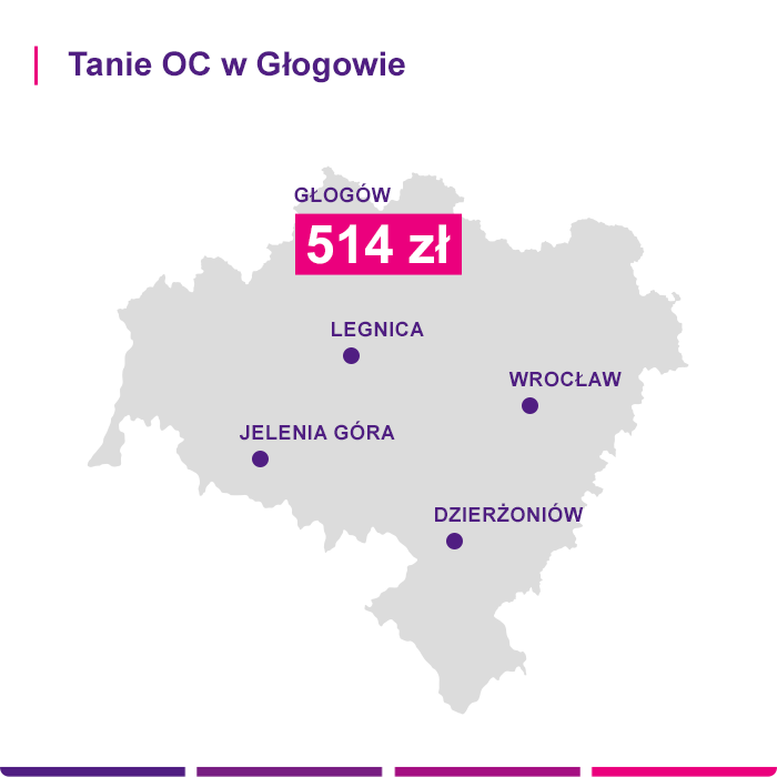 Województwo dolnośląskie oferuje zróżnicowane ceny za ubezpieczenia komunikacyjne. Głogów nie jest pod tym względem wyjątkiem. We Wrocławiu za polisę kierowcy zapłacą inną kwotę niż w Legnicy czy Lubinie. Ostateczny koszt polisy ubezpieczeniowej zależy od kilku czynników, dlatego warto skorzystać z kalkulatora LINK4, który w łatwy sposób przeliczy koszt Twojego ubezpieczenia lub skontaktować się z konsultantem