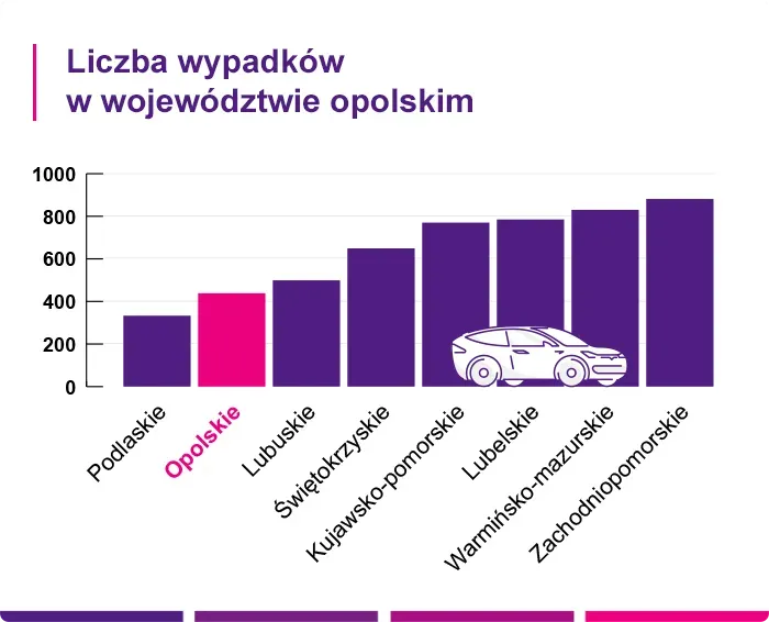 Opolszczyzna jest jednym z rejonów w Polsce, w którym doszło do najmniejszej ilości wypadków. Najwięcej groźnych sytuacji na drodze doszło w Wielkopolsce (2299 wypadków) oraz w Małopolsce (2226 wypadków).