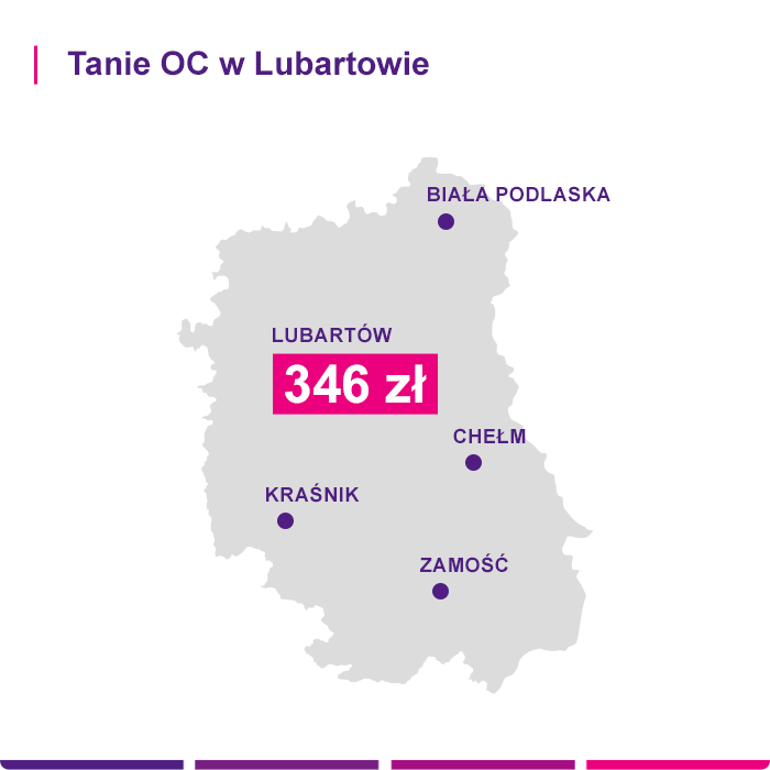 Województwo lubelskie oferuje dość przystępne ceny za ubezpieczenia komunikacyjne. Lubartów jest stosunkowo tanią lokalizacją. Między poszczególnymi miastami mogą występować różnice w cenach. W porównaniu do miast powiatowych innych regionów, na przykład okolic Trójmiasta czy Dolnego Śląska, ceny również mogą być inne. Na to, ile zapłacisz za ubezpieczenie, wpływa wiele kryteriów – nie tylko tych związanych z lokalizacją.