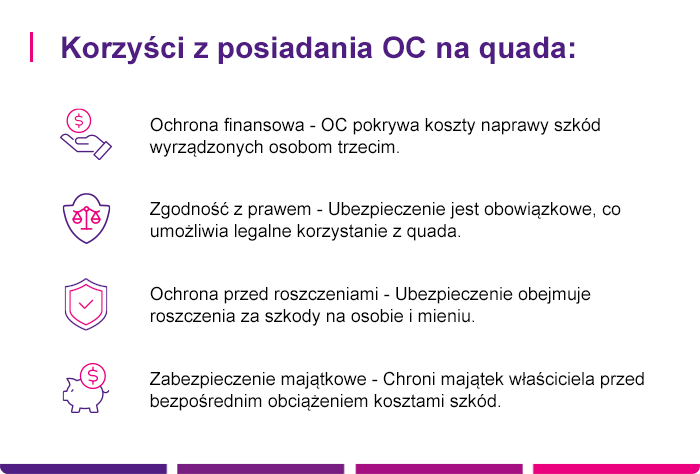 Jaki jest zakres ochrony ubezpieczeniowej? OC na quada – tak jak w przypadku OC na każdy inny pojazd mechaniczny - chroni Cię przed finansowymi skutkami szkód, które możesz wyrządzić w wyniku użytkowania quada. Oznacza to, że jeśli spowodujesz wypadek, Ty nie płacisz np. za naprawę uszkodzonego mienia innej osoby z własnej kieszeni, ale pokrywa to Twoje OC.